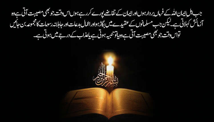 اس تاریخی پس منطر کو سامنے رکھتے ہوئے ہم جائزہ لیں اور دیکھیں کہ کیا وجہ ہے کہ بھارت میں حالات مسلمانوں پر سخت ہوتے جارہے ہیں اور اللہ کی مدد نہیں آرہی ہے؟کیایہ حالات آزمائش ہیں یا یہ عذابِ الہی ہے؟ جب اہلِ ایمان اللہ کے فرماں بردار ہوں اور ایمان کے تقاضے پورے کررہے ہوں اس وقت جو بھی مصیبت آتی ہے وہ آزمائش کہلاتی ہے۔لیکن جب مسلمانوں کے عقیدے میں بگاڑ ہواور اعمال بدعات اور جاہلانہ رسومات کا مجموعہ بن جائیں تو اس وقت جو بھی مصیبت آتی ہے وہ یا تو تنبیہ ہوتی ہے یا عذاب کے درجے میں ہوتی ہے ۔ مسلم معاشرے کا جب ہم جائزہ لیں تو یہ بات سامنے آتی ہے کہ بہت ہی قلیل تعداد ایسے مسلمانوں کی ہے جو اللہ کی بندگی میں خالص توحید کو اختیار کیے ہوئے ہیں اور جن کے اعمال سنتِ رسول کے مطابق ہیں جو اللہ کی نظر میں اعمالِ صالحات قرار پاتے ہوں ۔