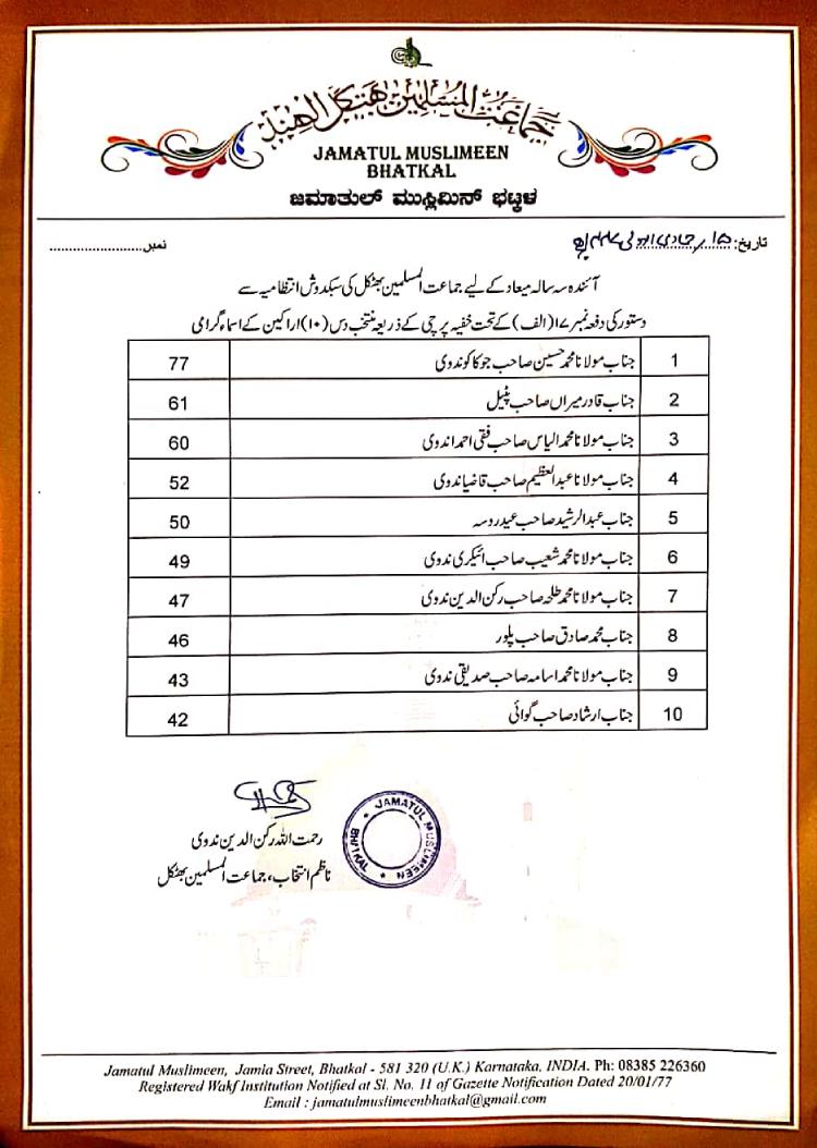 جماعت المسلمین بھٹکل موجودہ ناظمِ انتخاب مولانا رحمت اللہ رکن الدین ندوی کی جانب سے جاری معلومات کے مطابق جماعت کے دستور کے دفعہ نمبر 17 الف کے تحت سبکدوش انتظامیہ سے آئندہ سہ سالہ میعاد کے لیے  دس اراکین کا انتخاب خفیہ بیلرٹ پیپر کےتحت ہونے والے الیکشن میں ہوا جس میں مندرجہ ذیل اراکین کا انتخاب عمل میں آیا ہے۔