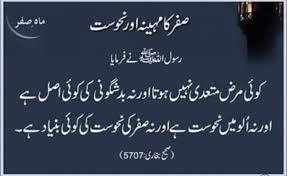 حضرت ابو ہریرہ رضی اللہ عنہ سے روایت ہے، رسول اللہ صلی اللہ علیہ وسلم نے فرمایا:’’کوئی بیماری متعدی نہیں ، بد فالی اور بد شگونی کی بھی کچھ حقیقت نہیں۔ نہ الو کا بولنا (کوئی برا اثر رکھتا)ہے اور نہ ہی ماہ صفر (منحوس)ہے۔‘‘ (صحیح البخاری:5757)