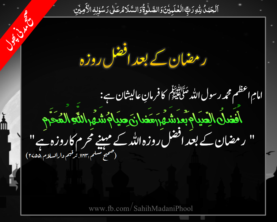 حضرت ابو ہریرہ ؓروایت کرتے ہیں کہ رسول اللہ ﷺ نے فرمایا :’’ ماہ رمضان کے بعد سب سے افضل روزہ اللہ کے مہینہ محرم کا روزہ سے ‘‘(ترمذی ‘‘اس حدیث میں محرم کو اللہ کا مہینہ کہا گیا ہے ۔یوں تو سب مہینے اللہ کے بنائے ہوئے ہیں مگر محرم کے مہینہ کو اللہ کا مہینہ کہا گیا ہے ۔جس سے اس مہینے کی حرمت و عظمت کا اندازہ لگایا جاسکتاہے۔